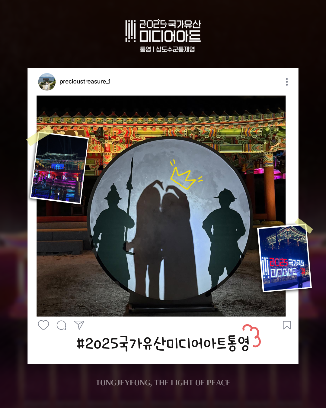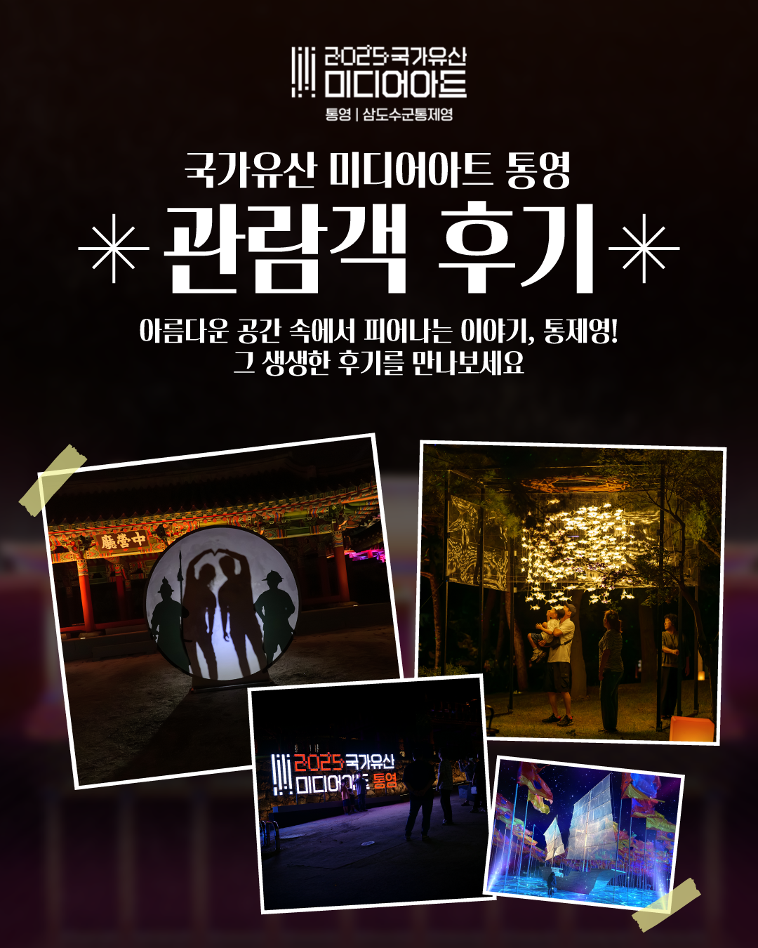 ![]() ![]() ![]() ![]() ![]() ![]() 2025 국가유산 미디어아트 통영 | 삼도수군통제영 〈통제영, 평화의 빛〉 관람 후기 : 아름다운 공간, 통제영에서 만든 추억을 생생한 후기로 남기고 공유해보세요! 관람 후기 공유 방법! ① 9개의 ZONE에서 추억으로 남긴 사진/영상을 선택 ② @tongyeongcf 태그 및 필수 해시태그와 함께 인스타그램 업로드 ◆ 필수 계정 태그 @tongyeongcf ◆ 필수 해시태그 #2025국가유산미디어아트통영 #통영미디어아트 #통제영평화의빛 #삼도수군통제영 통영의 밤, 그 빛 속에 당신의 추억을 더하세요 당신의 한 컷이 통제영의 또 다른 빛이 됩니다. |