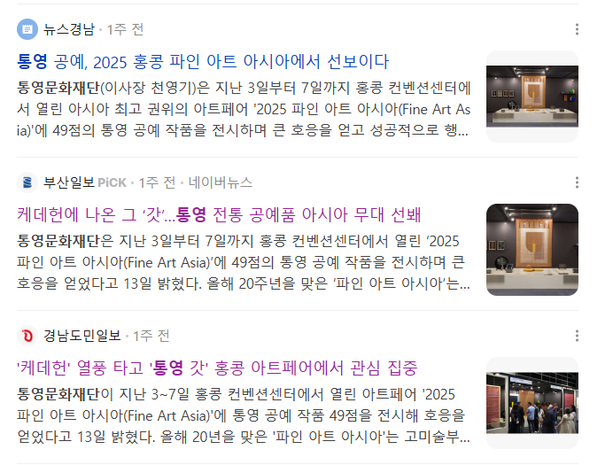 ![]() 통영문화재단이 지난 3~7일 홍콩 컨벤션센터에서 열린 아트페어 ‘2025 파인 아트 아시아(Fine Art Asia)’에 통영 공예 작품 49점을 전시해 호응을 얻었다고 13일 밝혔다. 올해 20년을 맞은 ‘파인 아트 아시아’는 고미술부터 현대 공예·장신구·조각·미디어 아트에 이르기까지 폭넓은 예술 장르를 아우르는 국제 아트페어다. 이번 행사에는 100여 곳 갤러리와 예술기관이 참여했다. 그중 통영관은 유일하게 국가와 시 지원으로 참가한 부스로, 한국 전통공예 미학을 전달해 주목을 받았다. 전시는 통영 국가무형유산 보유자의 공예작품들을 중심으로 기획됐다. △갓(갓일 정춘모) △대발(염장 조대용) △두석(두석장 김극천) △나전(나전장 박재성) △소목(소목장 전승교육사 김금철) △누비(조성연·정숙희 작가) 작품이 전시됐다. 특히 정교하고 섬세한 기술이 집약된 통영 대발과 나전 작품은 외국 갤러리 관계자들과 컬렉터들의 호평을 받았다. <케이팝 데몬 헌터스> 열풍으로 외국인들에게도 잘 알려진 통영 갓 또한 관람객에게 높은 관심을 받았다. 일부 작품은 현장에서 판매 계약이 이뤄졌다. 파인 아트 아시아 관계자는 “통영 공예는 오랜 전통과 기술력을 바탕으로 한층 현대화된 표현력을 갖추고 있으며, 세계적인 예술 플랫폼에서 통영 작가들 작품이 주목받은 것은 지역 공예의 국제적 가능성을 보여준 매우 뜻 깊은 성과”라고 밝혔다. /정봉화 기자 출처 : 경남도민일보(https://www.idomin.com) |